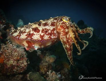 There are no cuttlefish in the Caribbean. Period. The Caribbean reef squid is found throughout the Caribbean Sea as well as off the coast of Florida, typically in small schools of four to thirty and often observed near shore by divers and snorkelers. Reef squid are often confused with cuttlefish because they have large fins that wrap around their mantles. I have also observed and photographed the longfin squid in St. Croix.
